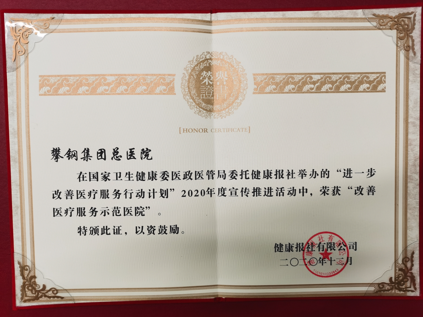 醫(yī)院2011年榮獲國家衛(wèi)生部“全國醫(yī)院管理創(chuàng)新(提名)獎”;2013—2014年度榮獲四川省醫(yī)院協(xié)會 “城市醫(yī)院管理優(yōu)秀獎”;2014年度榮獲攀鋼集團(tuán)公司“攀登”銀獎、鞍鋼集團(tuán)公司“先進(jìn)單位”;2015年度榮獲攀鋼“優(yōu)秀班子”稱號;2019年度榮獲通用技術(shù)環(huán)球醫(yī)療“業(yè)務(wù)創(chuàng)新獎”;2020年度榮獲國家衛(wèi)生健康委醫(yī)政醫(yī)管局“改善醫(yī)療服務(wù)示范醫(yī)院”稱號、四川省醫(yī)院協(xié)會“醫(yī)院醫(yī)療保險管理工作先進(jìn)單位”稱號、攀枝花市“抗擊新冠肺炎疫情先進(jìn)集體”稱號、攀枝花市衛(wèi)生健康委“新冠肺炎醫(yī)療救治工作先進(jìn)單位”稱號及通用技術(shù)環(huán)球醫(yī)療“業(yè)績突出貢獻(xiàn)獎”等3個集體獎項(xiàng);2021年榮獲“中央企業(yè)先進(jìn)基層黨組織”、通用技術(shù)集團(tuán)“先進(jìn)集體”、“先進(jìn)基層黨組織”、通用技術(shù)環(huán)球醫(yī)療“先進(jìn)基層黨組織“稱號。