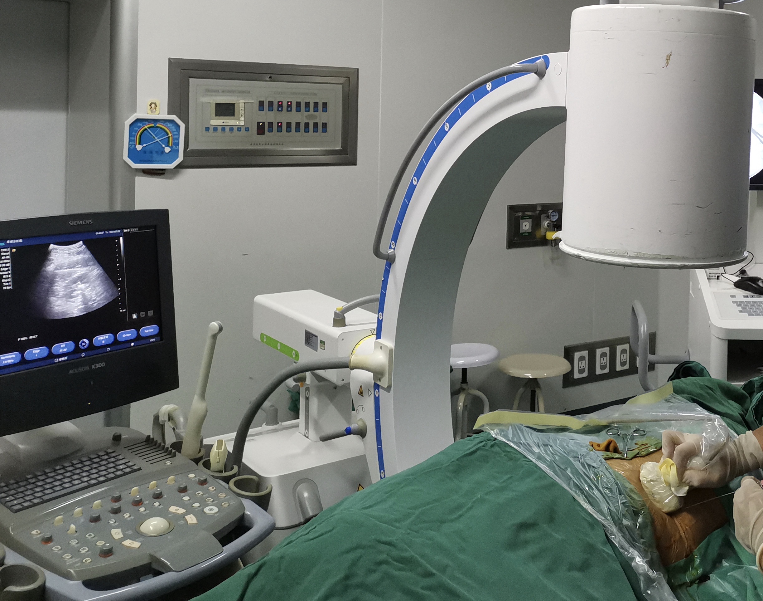 面對復(fù)雜的病例,主任王勇、副主任肖川多次組織科內(nèi)醫(yī)生組討論,認(rèn)真評估手術(shù)風(fēng)險,最終決定采用超聲聯(lián)合C臂X線直視,經(jīng)皮腎鏡手術(shù)碎石取石手術(shù)。術(shù)中超聲穿刺腎臟的優(yōu)勢在于經(jīng)過體表穿刺腎臟路徑最短,C臂X線動態(tài)監(jiān)測能更好地通過直視擴張經(jīng)皮腎,最大限度地避免通道丟失。