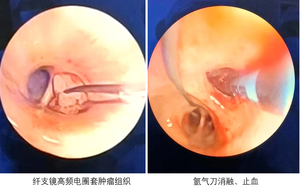 考慮到患者有淋巴結(jié)轉(zhuǎn)移、肺氣腫、肺部功能較差,患者和家屬拒絕外科手術,可否采用微創(chuàng)介入的手術方式進行?科室在病情討論中,病區(qū)主任、介入組長袁熙大膽提出了廣泛應用的內(nèi)鏡下高頻電圈套聯(lián)合氬氣刀,這樣可以最大限度保證患者的肺功能,而且為他后期的全身治療提供了機會。雖然手術難度和風險對醫(yī)生的技術是很大的考驗,但是目前科室的纖支鏡技術水平已經(jīng)非常成熟。經(jīng)過一番熱烈的討論,大家一致認為此病例可采用經(jīng)纖維支氣管鏡高頻電圈套加氬氣刀兩者聯(lián)合的方式將氣道內(nèi)腫瘤進行切除。
