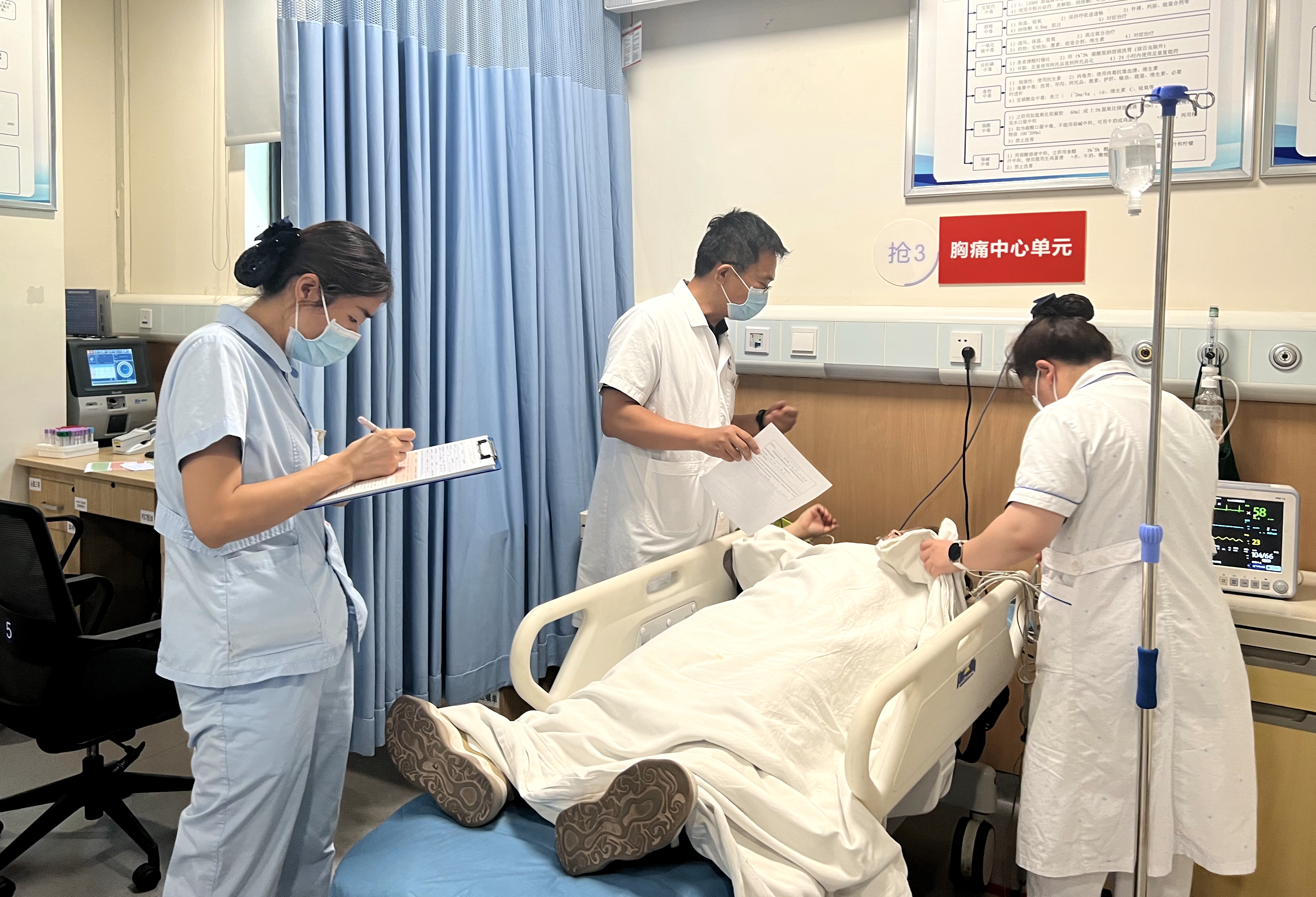 10:50分,“護(hù)士,門口有個(gè)人胸痛走不動(dòng)了......”急診科分診護(hù)士高朝麗見狀,立即輪椅將患者送入搶救室。急診科值班醫(yī)生陸正書詢問患者病史,護(hù)士李成先行床旁心電圖、抽血、查“心肌五項(xiàng)”、監(jiān)測(cè)生命體征。
