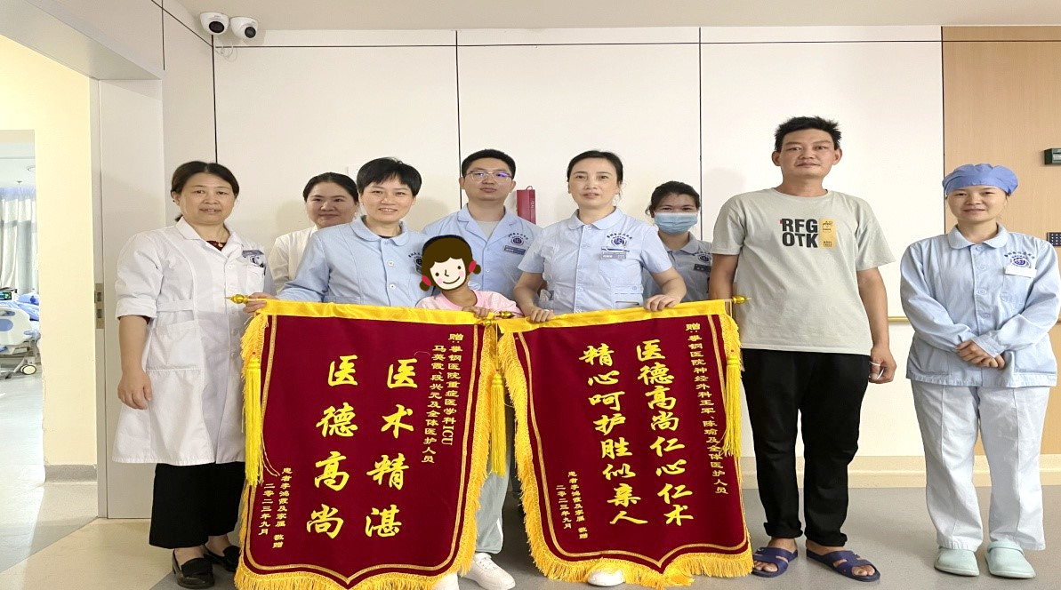 8月8日,神經(jīng)外科為小女孩進行了左側(cè)額葉的腦內(nèi)血腫清除術(shù)+側(cè)腦室切開引流術(shù)+矢狀竇修補術(shù)+去骨瓣減壓術(shù)。術(shù)后,經(jīng)過重癥醫(yī)學科全體醫(yī)護人員的精心救治,一周后,小女孩終于睜開了雙眼。這一刻,所有參與救治的醫(yī)護人員懸了幾天的心終于可以放下了。