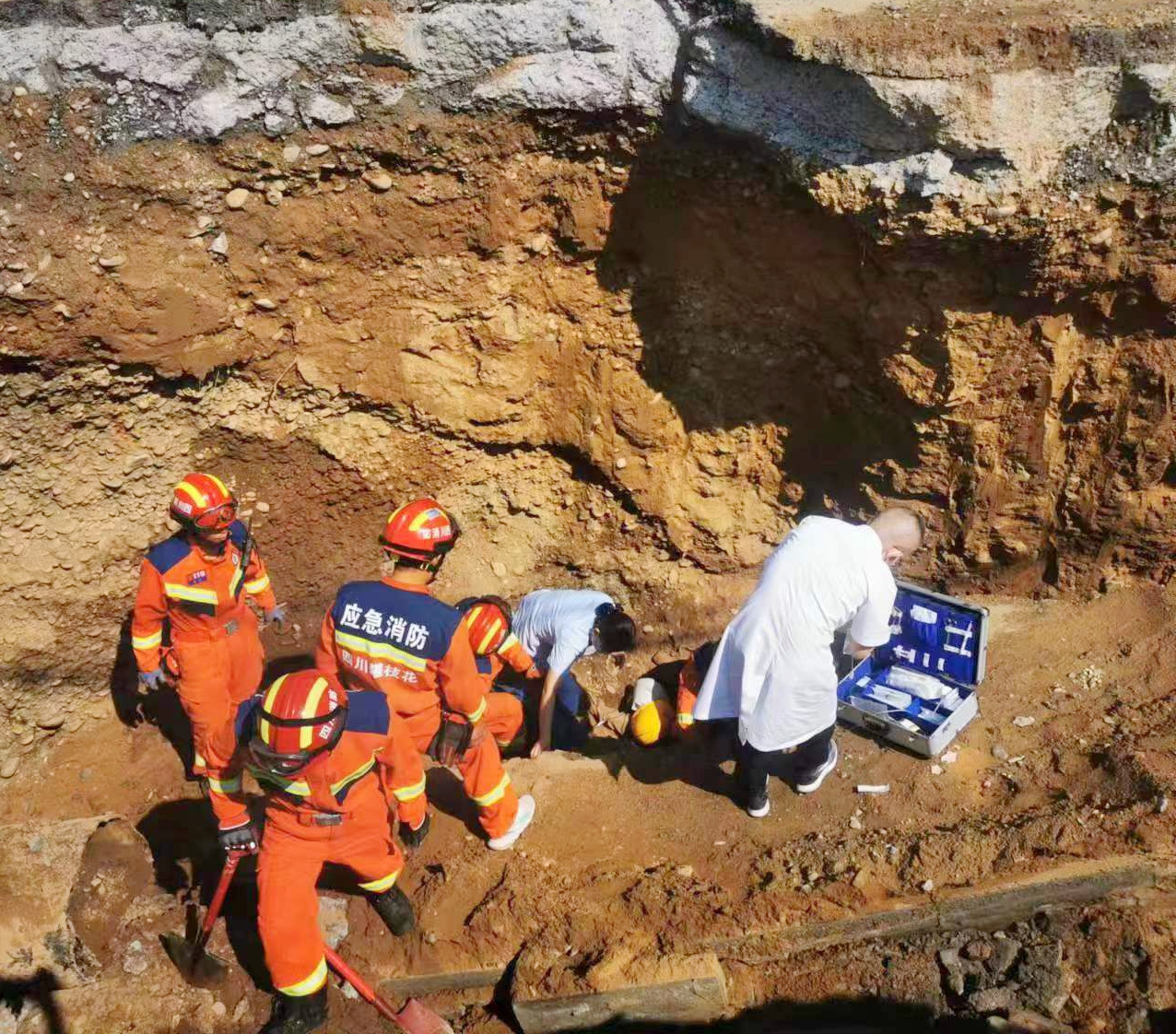 醫(yī)護人員立即隨120救護車出診,8分鐘后到達現(xiàn)場?,F(xiàn)場消防人員已清理了掩埋人員頭部及上肢周圍的沙石,患者神志還算清醒,發(fā)出痛苦的呻吟聲。與消防官兵協(xié)商后醫(yī)療救治立即展開。