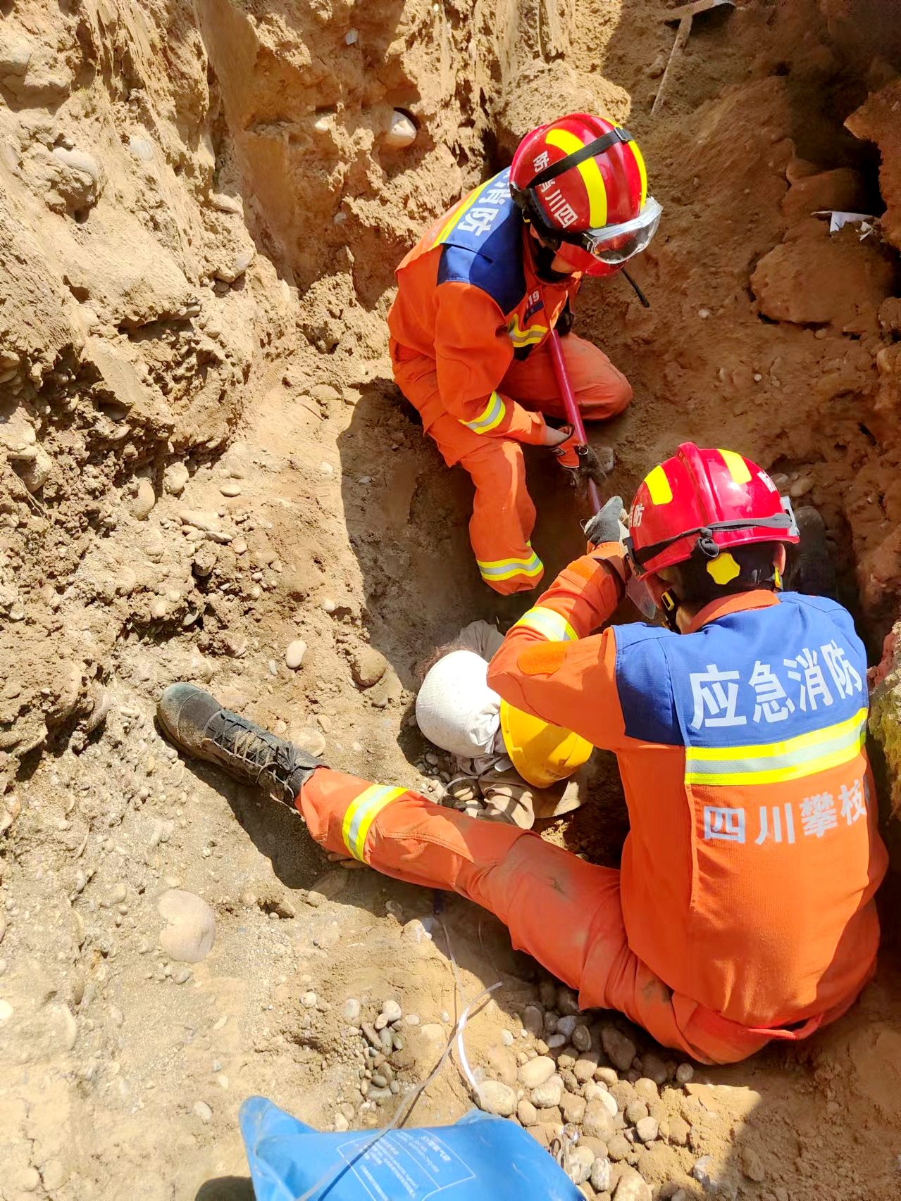 現(xiàn)場三十多度的高溫,患者整個身體還被埋在沙石里,為避免長時間日曬中暑,醫(yī)護人員先給她戴了一頂帽子遮陽,然后建立靜脈通道、給予吸氧。之后,醫(yī)護人員在一旁隨時觀察、詢問患者情況,不斷地安慰、鼓勵她。消防人員用手和鐵鍬一點點地挖,旁邊還時不時有沙石落下來。