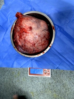 考慮到肌瘤巨大,為確保手術(shù)安全順利,醫(yī)務(wù)科組織了全院的多學(xué)科?;颊咴揪拓氀獓?yán)重,術(shù)中一旦出血量大,就會造成失血性休克,甚至危急生命,肌瘤剝離,腹壓突然減輕,呼吸及血壓如何把控……多學(xué)科討論后團(tuán)隊(duì)制定了縝密的手術(shù)方案,充分的術(shù)前準(zhǔn)備后手術(shù)如期進(jìn)行。手術(shù)中,主刀醫(yī)生一點(diǎn)點(diǎn)精準(zhǔn)剝離,好在肌瘤周圍組織還未出現(xiàn)種植和壓迫其他臟器的現(xiàn)象,但因患者本身貧血,肌瘤又非常之大,剝離過程中患者還是出現(xiàn)了失血狀況,手術(shù)團(tuán)隊(duì)及時(shí)給予輸血搶救,化險(xiǎn)為夷。手術(shù)雖然比較困難但還算順利,切下的子宮及肌瘤重達(dá)2645g!6天后患者恢復(fù)良好出院!